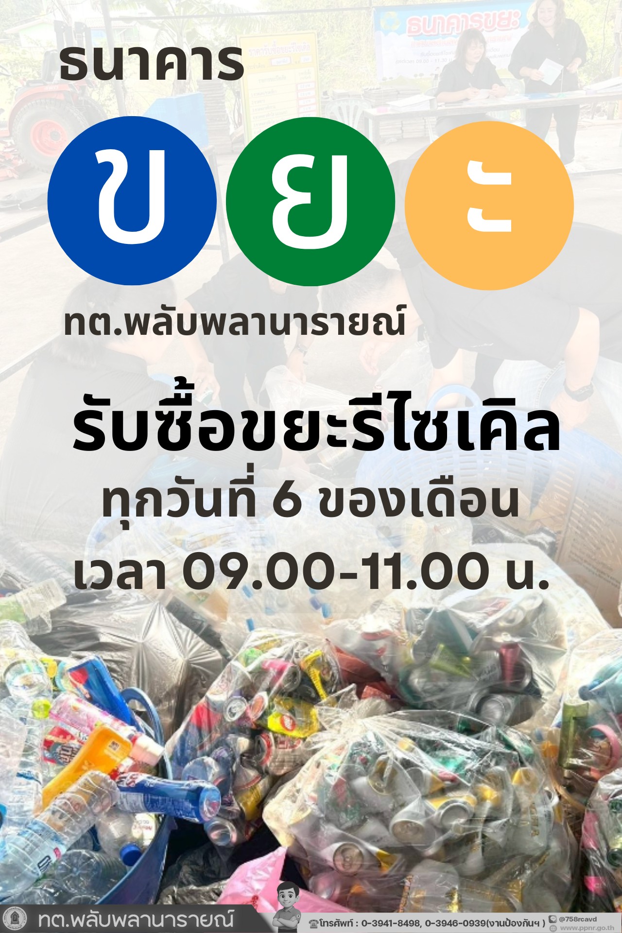 กิจกรรมธนาคารขยะของเทศบาลตำบลพลับพลานารายณ์ ประจำเดือนกุมภาพันธ์ 2569 6 ก.พ. 2569 308 ครั้ง กิจกรรมธนาคารขยะของเทศบาลตำบลพลับพลานารายณ์ ประจำเดือนกุมภาพันธ์ 2569 . วันที่ 6 กุมภาพันธ์ 2569 เวลา 09.00 น. ณ เทศบาลตำบลพลับพลานารายณ์ ได้จัดกิจกรรมธนาคารขยะเพื่อรับซื้อและรับฝากขยะรีไซเคิลจากประชาชนในเขตเทศบาลฯ ตามความมุ่งมั่นในการขับเคลื่อนพัฒนาสิ่งแวดล้อมอย่างต่อเนื่องของกระทรวงมหาดไทย ในการส่งเสริมให้องค์กรปกครองส่วนท้องถิ่นได้มีการจัดการขยะมูลฝอยโดยดำเนินการตามหลักการพัฒนาอย่างยั่งยืน ด้วยการจัดให้มีระบบจัดการและกำจัดขยะมูลฝอยที่มีประสิทธิภาพ สามารถนำไปใช้ให้เกิดประโยชน์ด้านอื่น ๆ ตามแนวคิดระบบเศรษฐกิจหมุนเวียน (Circular Economy) มาใช้ในการจัดการสิ่งปฏิกูลและมูลฝอยภายใต้หลักการ 3ช (3Rs) คือ ใช้น้อย (Reduce) ใช้ซ้ำ (Reuse) และนำกลับมาใช้ใหม่ (Recycle) . ติดต่อ เทศบาลตำบลพลับพลานารายณ์ โทรศัพท์ : 0-3941-8498-9 , 0-3946-0939 (งานป้องกันฯ) Line : https://lin.ee/IwlJEpU Website : http://www.ppnr.go.th/