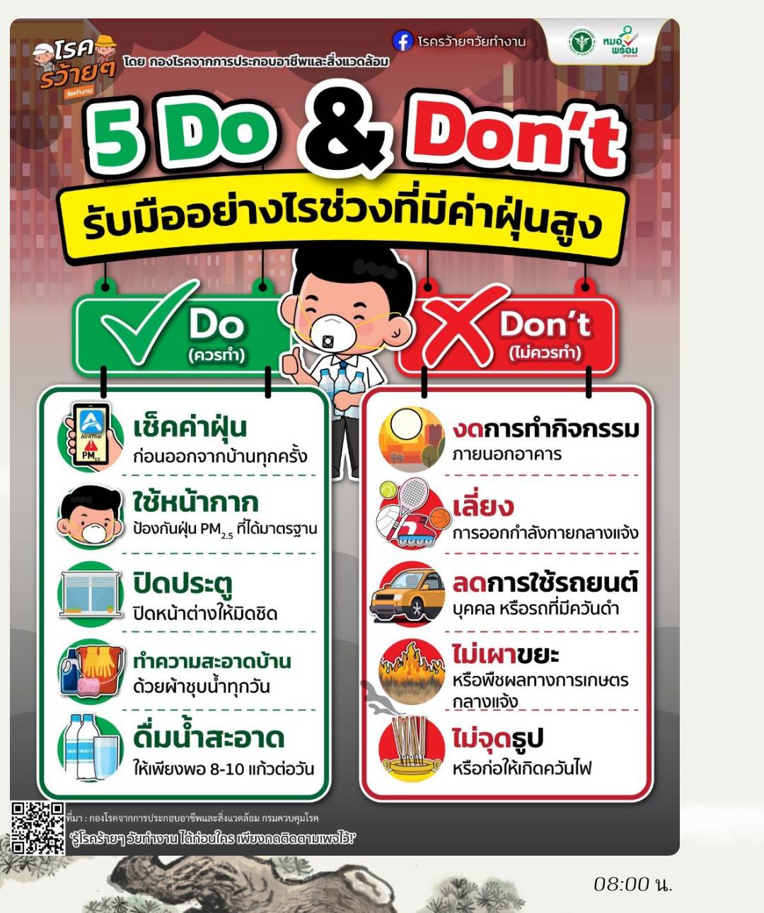 รับมืออย่างไรช่วงที่มีค่าฝุ่นสูง 18 ก.พ. 2569 198 ครั้ง 5 Do & Don't รับมืออย่างไรช่วงที่มีค่าฝุ่นสูง เช็คค่าฝุ่นก่อนออกจากบ้านทุกครั้ง ใช้หน้ากากป้องกันฝุ่น PM2.5 ที่ได้มาตรฐาน ปิดประตู ปิดหน้าต่างให้มิดชิด ทำความสะอาดบ้านด้วยผ้าชุบน้ำทุกวัน ดื่มน้ำสะอาดให้เพียงพอ 8-10 แก้วต่อวัน . งดการทำกิจกรรมภายนอกอาคาร เลี่ยงการออกกำลังกายกลางแจ้ง ลดการใช้รถยนต์บุคคล หรือรถที่มีควันดำ ไม่เผาขยะหรือพืชผลทางการเกษตรกลางแจ้ง ไม่จุดธูปหรือก่อให้เกิดควันไฟ