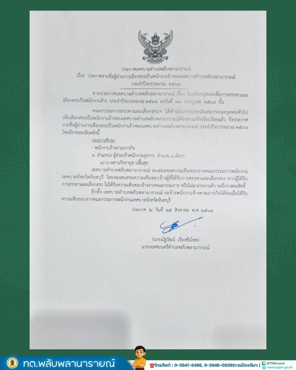 ประกาศ เรื่อง รายชื่อผู้ผ่านการเลือกสรรเป็นพนักงานจ้างของเทศบาลตำบลพลับพลานารายณ์ ประจำปีงบประมาณ 2568