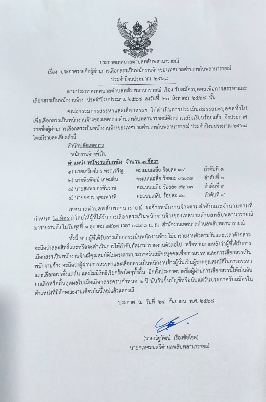 ประกาศ เทศบาลตำบลพลับพลานารายณ์ รายชื่อผู้ผ่านการเลือกสรรเป็นพนักงานจ้างของเทศบาลตำบลพลับพลานารายณ์ ประจำปีงบประมาณ 2568